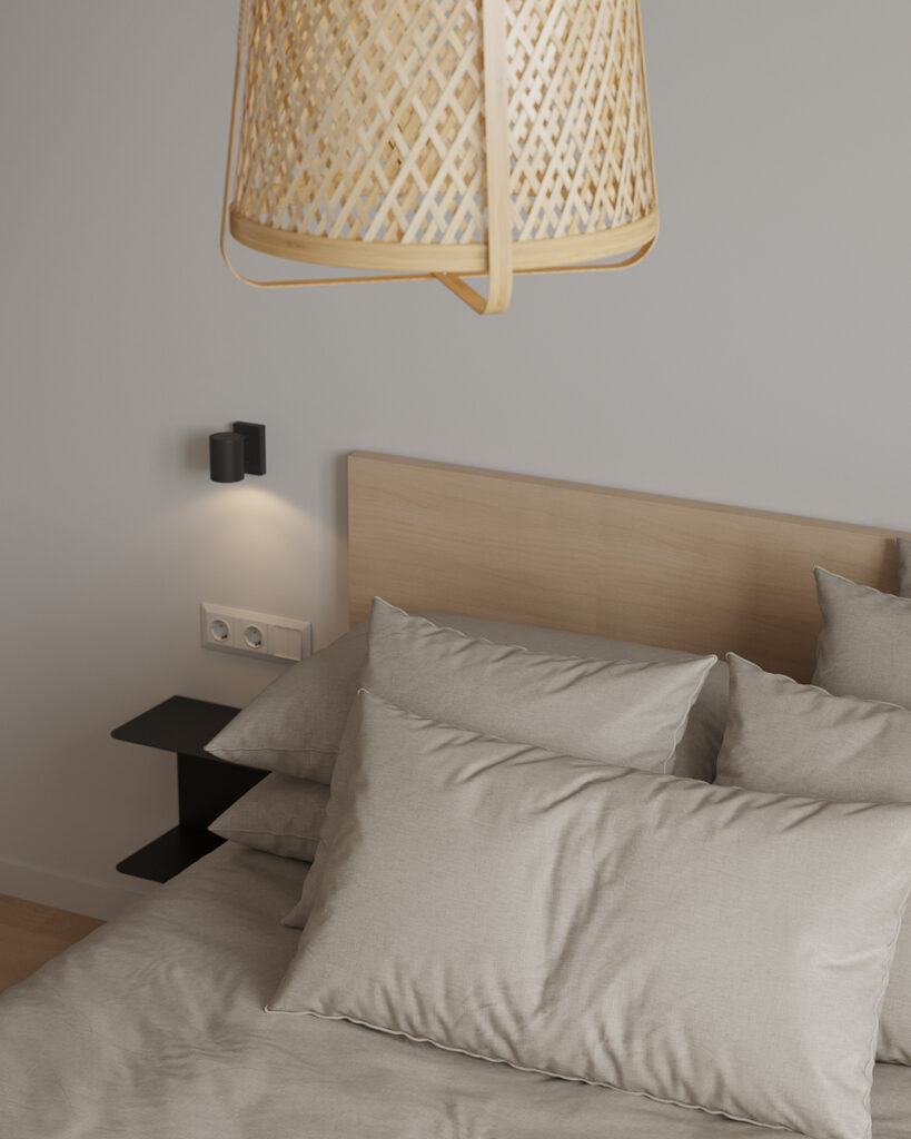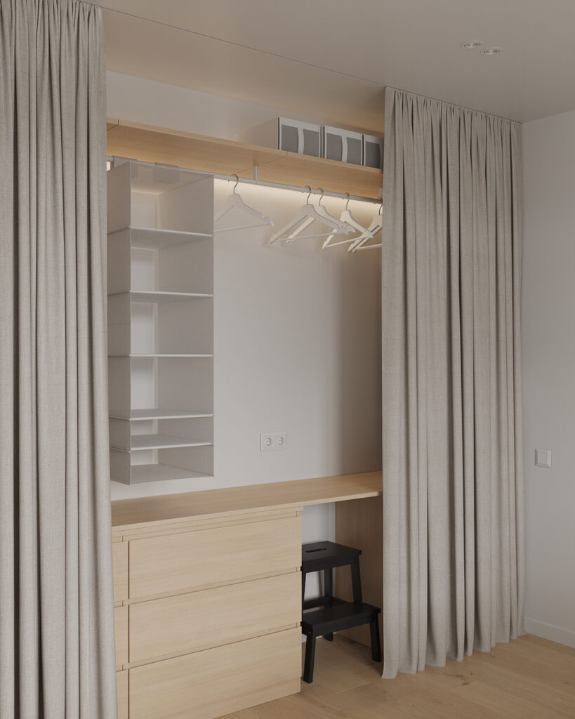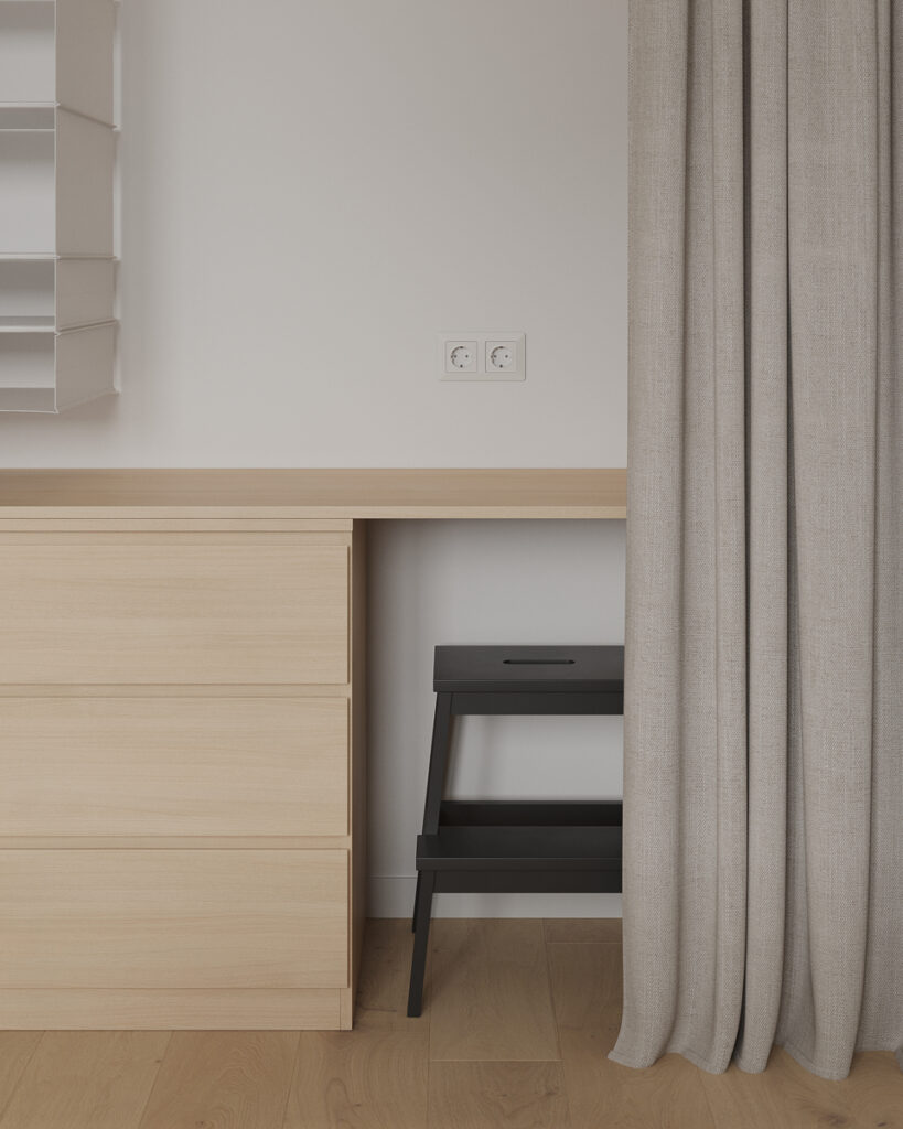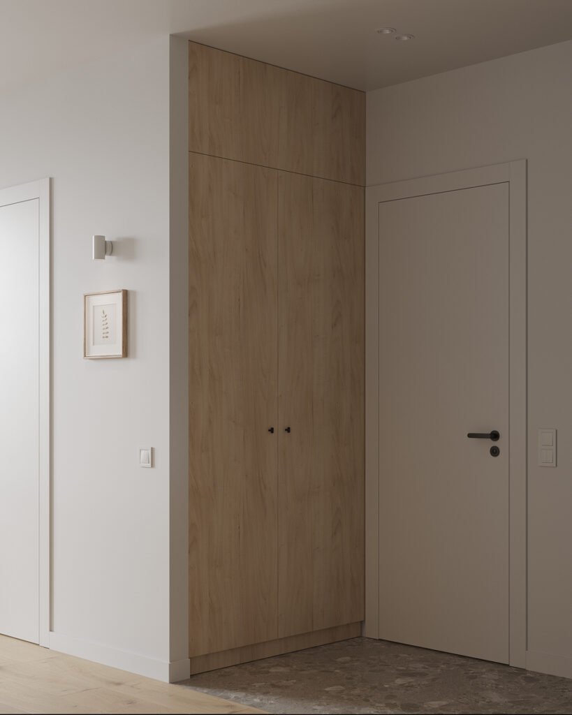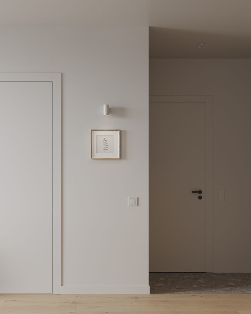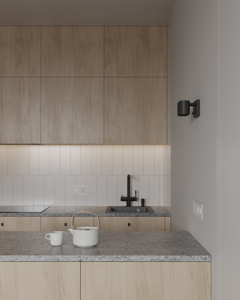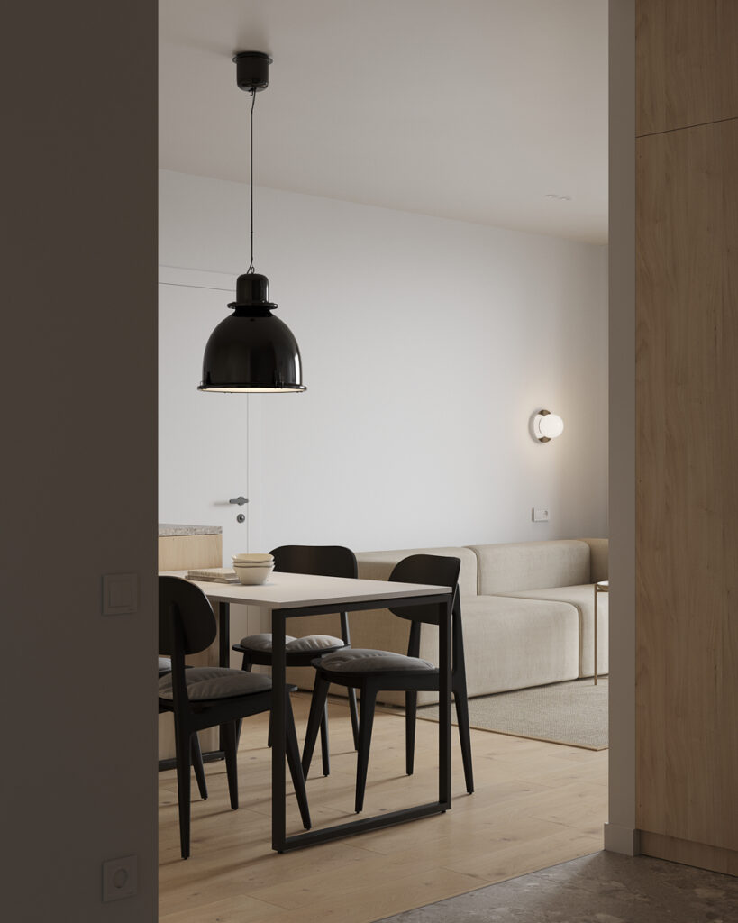 — Нейтральная палитра; — Простые формы и силуэты; — Рассеянный теплый свет; — Легкие в уборке материалы; — Приятная на ощупь фурнитура; — Экологичные материалы и мебель.